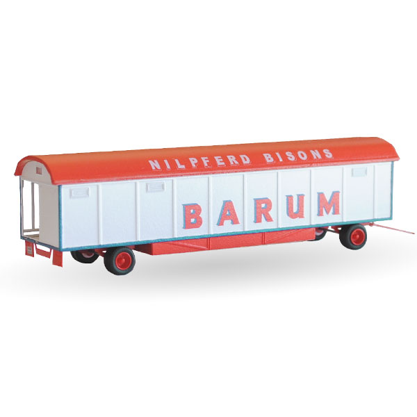 Der Nilpferdwagen des Circus Barum veränderte sich im Laufe der Zeit immer ein wenig. Diese Variante in 1:87 stellt den Wagen in der Zeit dar, als der Wagen primär als Nilpferdwagen genutzt wurde. Charakteristisch für diese Zeit sind das Käfiggitter und die Wagenklappe. Um den Wagen auch in einer etwas älteren Version als Nilpferd-Bisons Wagen darzustellen, liegt dem Bausatz neben dem Barum-Schriftzug auch die Dachbeschriftung “Nilpferd Bisons” bei, die entweder als Ganzes oder nur für die Beschriftung “Nilpferd” genutzt werden kann.