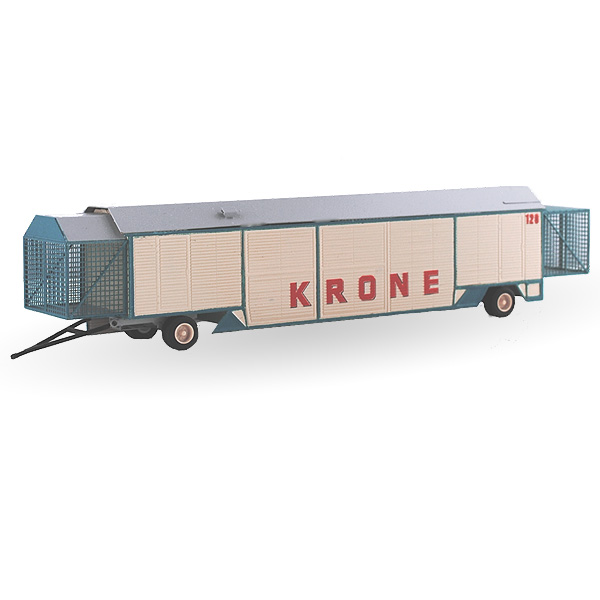 Unpainted kit of a Circus Krone exotic animal wagon #125 in scale 1:87 (H0) made of brass and plastic parts. The kit includes chassis, wheel-sets, decals, roof and ramps.The kit comes with a detailed construction manual. The pictures shown here in the shop, show a completely build and painted example. For assembling, different tools, glue and colors are needed.